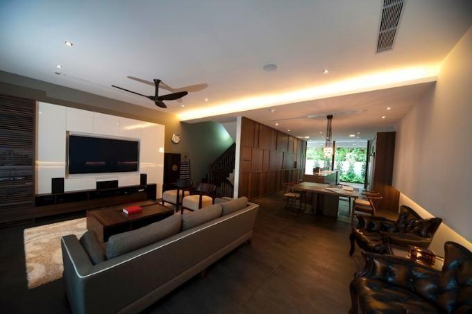 O calor desta sala de estar é em grande parte atribuído a esta parede característica de madeira de dois tons que vem com um nicho de TV recesso e prateleiras embutidas.